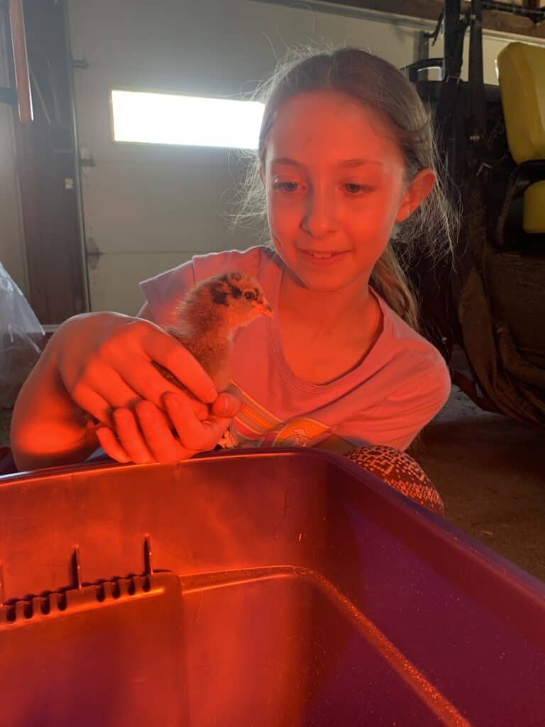 Line the bottom with pine shavings, clip a heat lamp to the side, add feeders and waterers, and you’re done. Seriously — it takes about 10 minutes to set up.